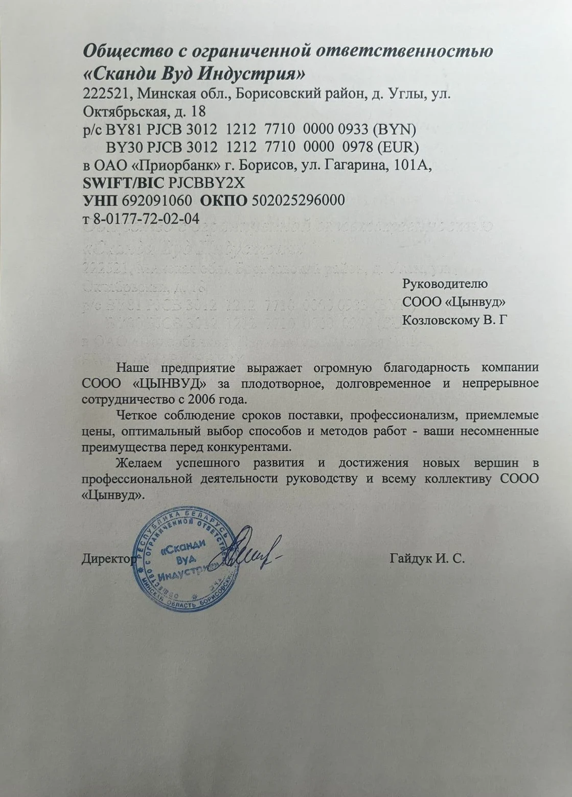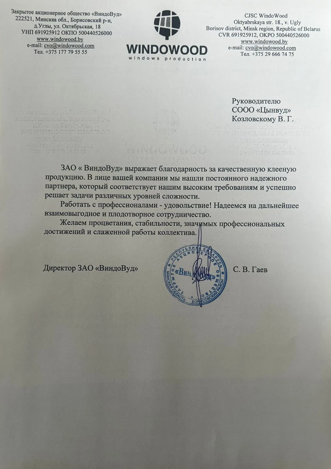 The company “Tsynwood” was founded in Belarus in 1999. During this time, we have managed not only to build a clear production policy, entering the market with a decent assortment of laminated timber, joinery, lamellas, edged lumber, fuel briquettes, etc., but also to become a recognized leader in this industry among Belarusian enterprises for processing and manufacturing glued wood products.